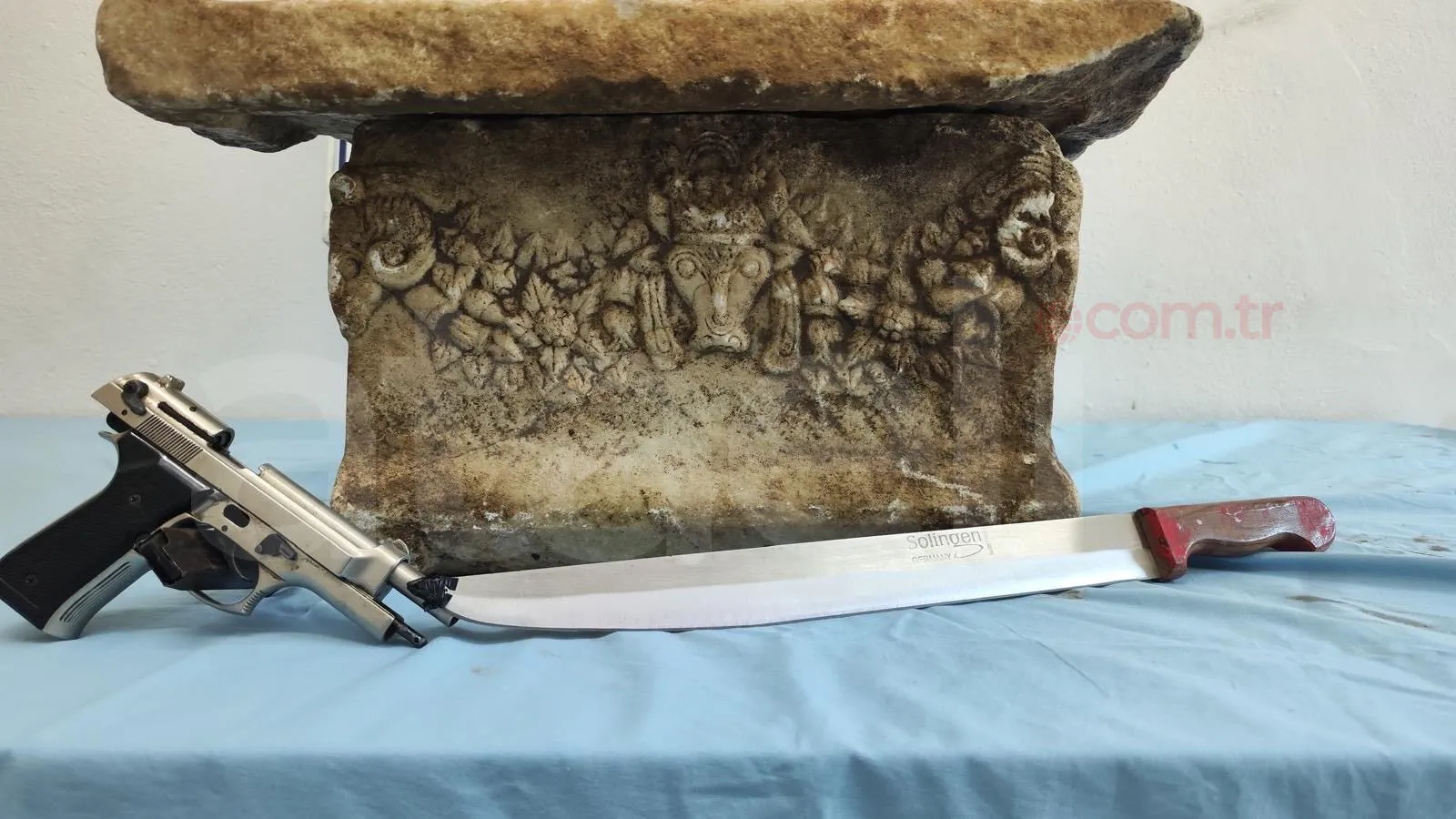 Belirlenen adrese yapılan operasyonda, Antik Roma ve Bizans dönemlerine ait olduğu değerlendirilen 1 adet lahit ile aynı dönemlere tarihlenen bir tarihi obje ele geçirildi. Aramalarda ayrıca 1 kurusıkı tabanca ve 1 bıçak bulundu.