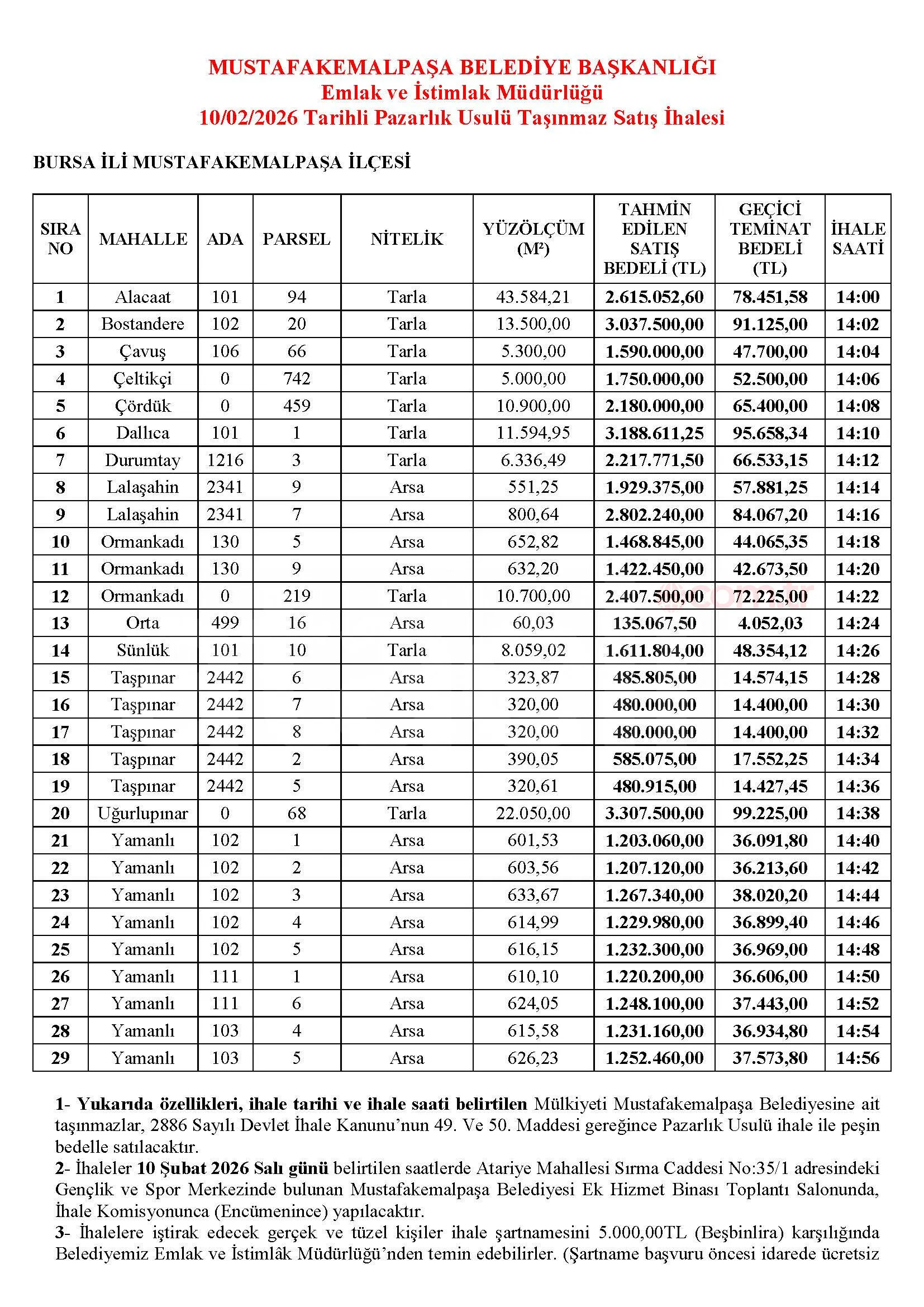 Mustafakemalpaşa Belediyesi web sitesinden 10 Şubat 2026 tarihli taşınmaz satış