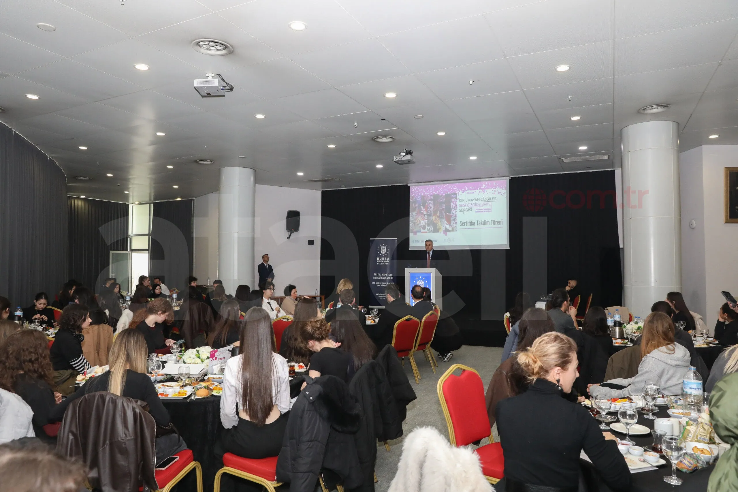 Dijital afiş sergisi kapsamında eser üreten öğrencilere, Atatürk Kültür Merkezi Merinos Yerleşkesi’nde düzenlenen törenle sertifikaları verildi. Programa, Bursa Büyükşehir Belediye Başkanı Mustafa Bozbey’i temsilen Bursa Büyükşehir Belediyesi Başkanvekili Mustafa Orkun Gazioğlu, okul yöneticileri, öğretmenler ve öğrenciler katıldı.